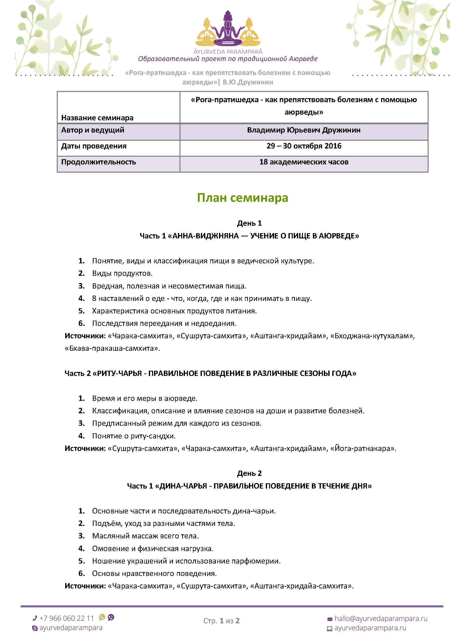 В рамках семинара В.Ю.Дружинина "Рога-пратишедха - как препятствовать болезням с помощью аюрведы", приглашаем вас посетить лекцию "Риту-чарья – правильное поведение в различные сезоны года".