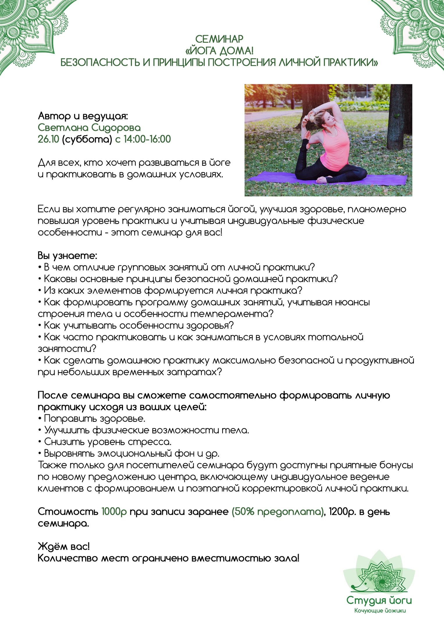 Если вы хотите регулярно заниматься йогой, улучшая здоровье, планомерно повышая уровень практики и учитывая индивидуальные физические особенности — этот семинар для вас!