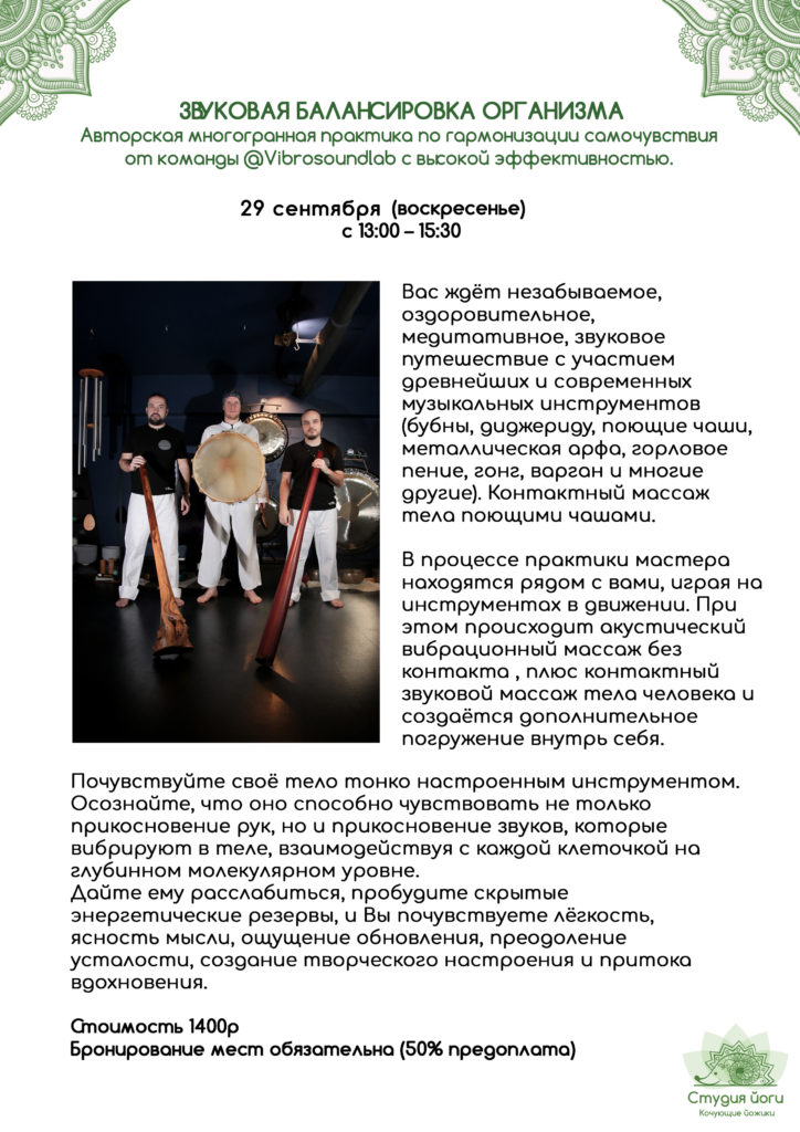 Вас ждёт незабываемое, оздоровительное, медитативное, звуковое путешествие с участием древнейших и современных музыкальных инструментов (бубны, диджериду, поющие чаши, металлическая арфа, горловое пение, гонг, варган и многие другие). Контактный массаж тела поющими чашами.